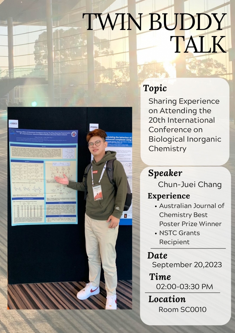 We have received much positive feedback from a talk we arranged in January about how to apply for an NTSC grant to attend an international conference. We know many students are planning to present their research abroad. Here, we are delighted to announce that Chun-Juei Chang, the winner of the Australian Journal of Chemistry Best Poster Prize is going to share his conference journey on September 20. Moreover, he will also share his tips on how to build a professional connection at a conference.